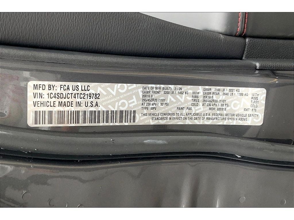MOPAR All Weather Package: MOPAR Front and Rear Door Entry Guards; Cargo Net; MOPAR Slush Mats. Blacktop Package: Eclipse Black Exhaust Tips; Integrated Roof Rail Crossbars; Satin Black Dodge Tail Lamp Badge; Black Roof Rails; Gloss Black Badges; Gloss Black Exterior Mirrors. Quick Order Package 22T GT Plus: Red Accent Stitching; 7 and 4 Pin Wiring Harness; Integrated Roof Rail Crossbars; Power Driver/passenger 4-Way Lumbar Adjust; LED Auxiliary Low Beam and Turn Signal; Power Sunroof; Exterior Mirrors with Heating Element; Auto Dim Exterior Driver Mirror; Dual Remote USB Port - Charge Only; Trailer Brake Control; Heated Second Row Seats; Black Roof Rails; Class IV Receiver Hitch; Blind Spot with Trailer Detection; Floor Console with Leather Armrest; Gloss Black Exterior Mirrors; Leather Trimmed Bucket Seats; Power 6x9 Multi-Function Foldaway Mirrors; Power Tilt and Telescopic Steering Column; Exterior Mirrors with Supplemental Signals; Power 8-Way Driver Memory 8-Way Passenger Seats; Ventilated Front Seats; Full Speed Forward Collision Warning Plus; Auto High Beam Headlamp Control; 115V Auxiliary Power Outlet; Exterior Mirrors with Memory; Adaptive Cruise Control with Stop; Leather Wrapped Door Panels; Radio/driver Seat/mirrors Memory. Tow 'n Go Package: Brembo Brakes; 7 and 4 Pin Wiring Harness; High Performance Suspension; Adaptive Damping; Automatic Headlamp Leveling System; Performance Tuned Steering; 160 Mph Primary Speedometer; Pirelli Brand Tires; High Performance Exhaust; LED Auxiliary Low Beam and Turn Signal; 20" X 10" Forged Y-Spoke Satin Black Wheels; Trailer Brake Control; Active Noise Control System; Electronic Limited Slip Differential Rear Axle; Run Flat Tires; Drive Modes - Sport/track/tow/snow; Delete Spare Tire; Class IV Receiver Hitch; Body Color Upper and Lower Rear Fascia; Blind Spot with Trailer Detection; Black Brake Calipers; Quadra-Trac Active on Demand 4WD. Vapor Gray. **Equipment listed is based on original vehicle build and subject to change. Please confirm the accuracy of the included equipment by calling the dealer prior to purchase.**