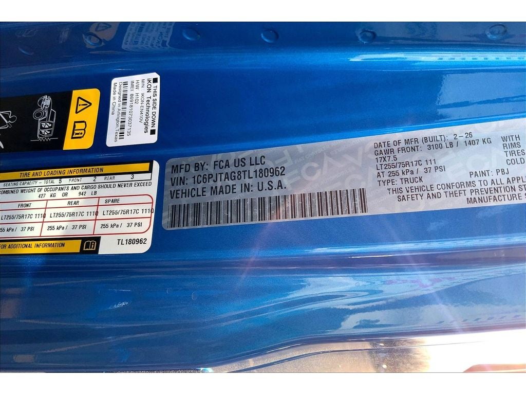 Convenience Group: Emergency/Assistance Call; Front Door Locks 2-Door Passive Entry; Remote Start System; Body Color Fender Flares (2-Piece); Cluster 7.0" TFT Color Display; Universal Garage Door Opener; Daytime Running Lamp System; Heated Front Seats; Air Conditioning W/Auto Temp Control; Heated Steering Wheel; Corning Gorilla Glass. Safety Group: Auto High Beam Headlamp Control; Blind Spot & Cross Path Detection; LED Taillamps; ParkSense Rear Park Assist System. Quick Order Package 24W Willys: LED Taillamps; Protection Sill Rails; 4-Wheel Drive Decal; Black Grille W/Gloss Black Rings; MOPAR All-Weather Slush Mats; LT255/75R17C OWL On/Off Road Tires; Body Color Fender Flares (2-Piece); Front Heavy Duty Red Accent Shock Absorbers; Daytime Running Lamps LED Accents; Front LED Fog Lamps; LED Premium Reflector Headlamps; E-Locker Rear Axle; Corning Gorilla Glass; Trailer Hitch Zoom; Class IV Receiver Hitch; Security Alarm; Mold In Color Bumper W/Gloss Black; Advanced Brake Assist; Willys Suspension; Heavy Duty Engine Cooling; Automatic Headlamps; Air Conditioning W/Auto Temp Control; 5. 950 lbs GVWR; Deep Tint Sunscreen Windows; Off-Road Plus Mode; 17" X 7.5" Painted Black Wheels; Willys Hood Decal; Full Speed Forward Collision Warning Plus; Rear Heavy Duty Red Accent Shock Absorbers; Front Door Locks 2-Door Passive Entry; Cluster 7.0" TFT Color Display; Power Heated Mirrors; Auxiliary Switches; Premium Wrapped Steering Wheel; Sun Visors W/Illuminated Vanity Mirrors. Black 3-Piece Hard Top. Alpine Premium Audio System. MOPAR Hardtop Headliner. MOPAR Spray In Bedliner. **Equipment listed is based on original vehicle build and subject to change. Please confirm the accuracy of the included equipment by calling the dealer prior to purchase.**