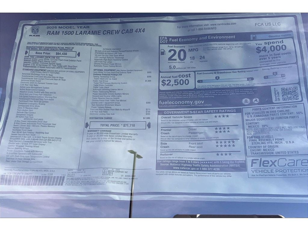 This unit has automated speed control that adjusts to maintain a safe following distance, enhancing highway driving convenience. You'll never again be lost in a crowded city or a country region with the navigation system on it. See what's behind you with the back up camera on this 1/2 ton pickup. The vehicle's Forward Collision Warning feature alerts drivers to potential front-end collisions. The vehicle is pure luxury with a heated steering wheel. The leather seats in this 2026 Ram 1500 are a must for buyers looking for comfort, durability, and style. Never get into a cold vehicle again with the remote start feature on it. This model comes equipped with Android Auto for seamless smartphone integration on the road. This vehicle features a hands-free Bluetooth® phone system. The Ram 1500 offers Apple CarPlay for seamless connectivity. This 1/2 ton pickup shines with clean polished lines coated with an elegant white finish.