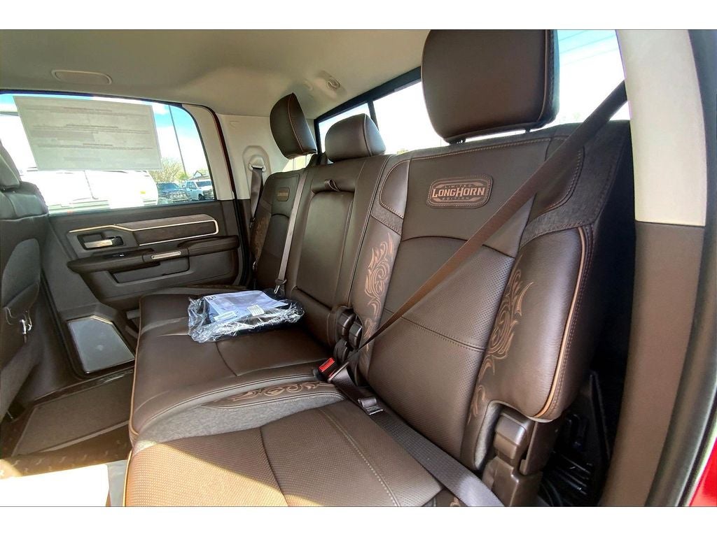 Cold Weather Group: Engine Block Heater; MOPAR Winter Front Grille Cover. Quick Order Package 24K Longhorn: Luxury Front and Rear Floor Mats; Warm Chrome Key Fob; Longhorn Instrument Cluster Theme 3; Premium Filigree Leather Seats; I/P Aluminum Litho Bezels with Real Wood #1; Longhorn Badge. Longhorn Level 1 Equipment Group: Active Lane Management System; Center Stop Lamp with Cargo View Camera; MOPAR Trailer Camera Wiring with No Camera; Surround View Camera System; LED Bed Lighting; Power Deployable Running Boards; Traffic Sign Recognition; Trailer Tire Pressure Monitoring System; Adaptive Steering System; MOPAR Spray in Bedliner; Anti-Spin Differential Rear Axle; Drowsy Driver Detection; Trailer Reverse Guidance; Digital Rearview Mirror. Chrome Bumper Package: Bright Rear Bumper; Bright Front Bumper. Tow-Mode Digital Rearview Mirror Package: Tow-Mode Camera (wired); Digital Rearview Mirror. on Board Power System - 2.4KW: Dual Alternators Rated At 480 Amps. Auto Level Rear Air Suspension. Power Sunroof. MOPAR Trailer Camera Wiring with No Camera. Molten Red Pearlcoat. 5th Wheel/gooseneck Towing Prep Group. Instrument Panel Mounted Auxiliary Switches. Clearance Lamps. **Equipment listed is based on original vehicle build and subject to change. Please confirm the accuracy of the included equipment by calling the dealer prior to purchase.**