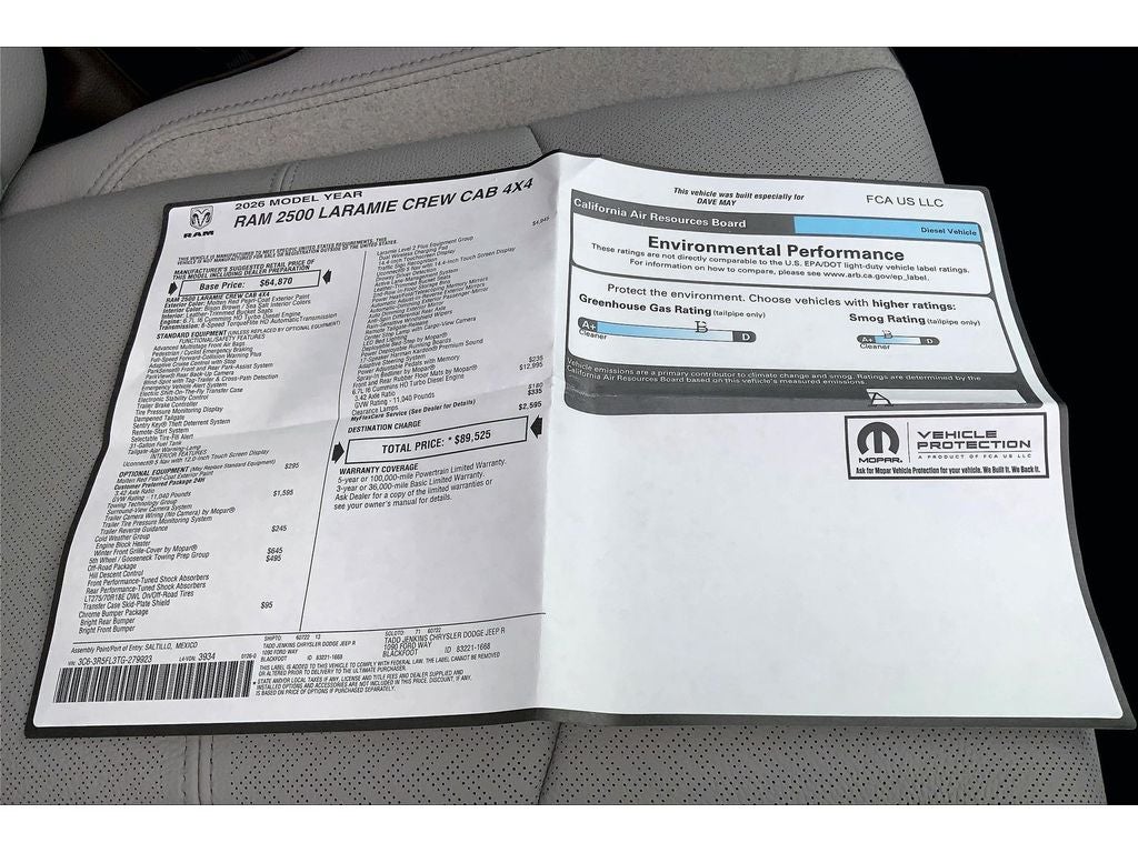 Check out this 2026 Ram 2500 Laramie 4WD with the powerful 6-cylinder 6.7L diesel engine — a rugged, refined truck primed for work and weekend adventures in and around Blackfoot, ID. This Laramie blends heavy-duty capability with upscale comfort, delivering exceptional towing and payload performance while providing a smooth, confident ride on city streets or rough terrain. Equipped with Adaptive Cruise Control for safer highway driving, a Back-Up Camera to simplify maneuvering and parking, and convenient Remote Start for instant climate comfort, this Ram is designed for modern convenience. Stay connected and entertained with Android Auto and a premium sound system that elevates every drive. The cabin offers premium materials and thoughtful technology, making long hauls comfortable and productive. Four-wheel drive ensures traction and control in Idaho's varied conditions, from snowy winters to muddy job sites. With this truck's proven diesel torque and durability, you'll handle heavy loads and demanding tasks with ease. Located in Blackfoot, ID, this 2026 Ram 2500 Laramie is priced to sell and represents the best price you'll find for this combination of features, performance, and luxury. Whether you're towing, hauling, or seeking a refined daily driver with serious capability, this Ram 2500 Laramie is ready to impress. Contact us to schedule a test drive and secure this exceptional value today.