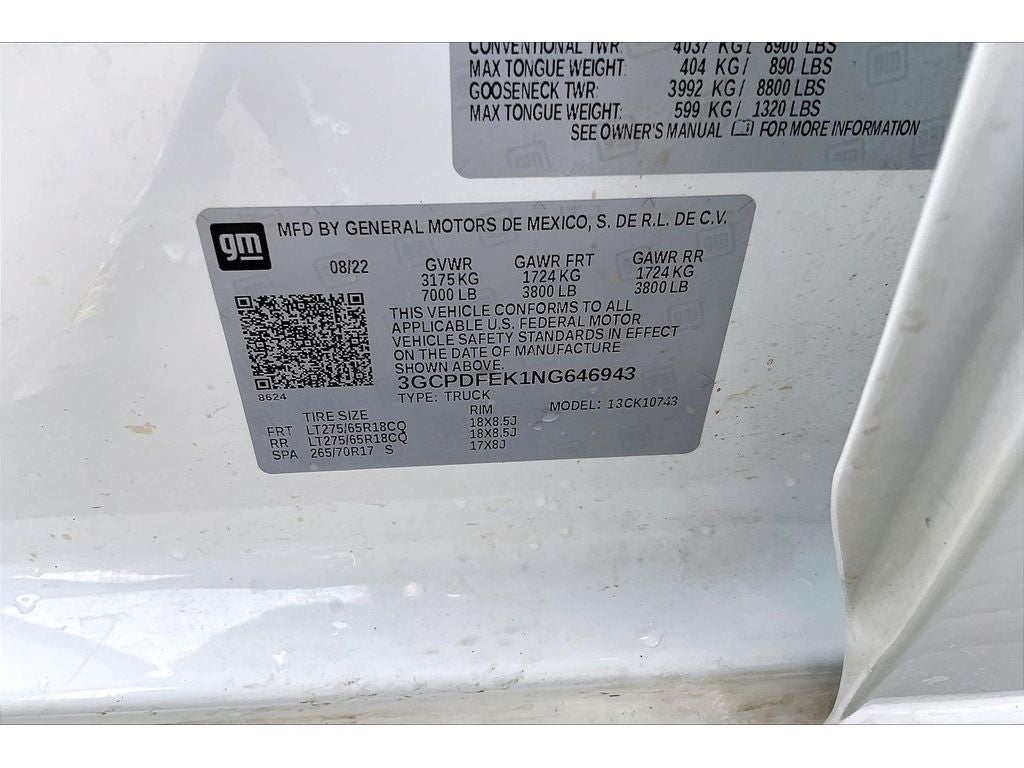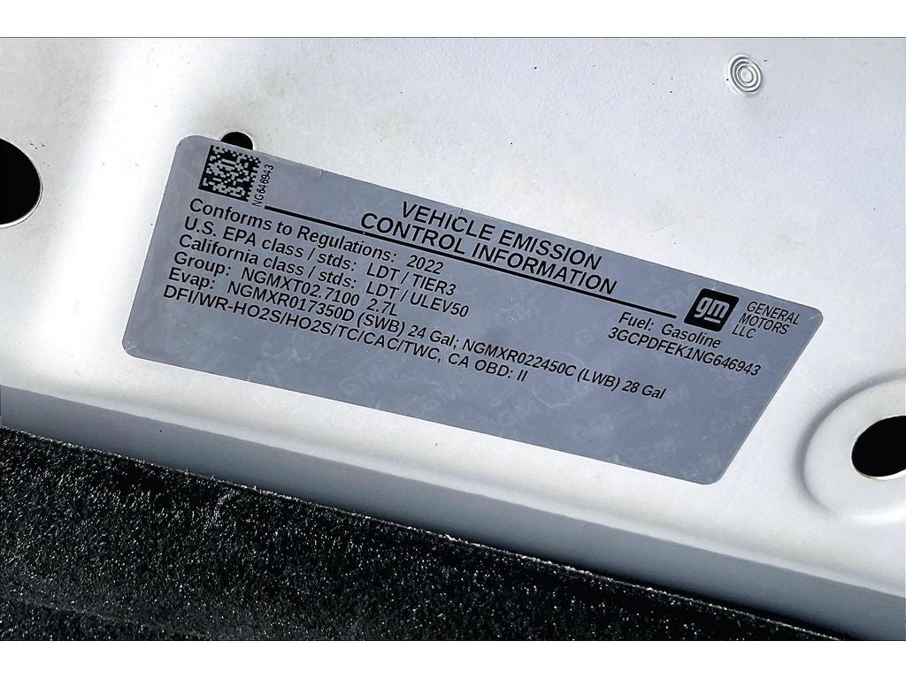 Preferred Equipment Group 2LT: HD Rear Vision Camera; LED Cargo Area Lighting; Rear 60/40 Folding Bench Seat (folds Up); Cloth Seat Trim; SiriusXM with 360L; Bluetooth® For Phone; LT275/65R18C MT BW Tires; Compass; Trailering Package; Electrical Steering Column Lock; Wireless Phone Projection; Standard Tailgate; Front LED Fog Lamps; 40/20/40 Front Split-Bench Seat; Suspension Package; Steering Wheel Audio Controls; Color-Keyed Carpeting Floor Covering; OnStar and Chevrolet Connected Services Capable; Power Front Windows with Passenger Express Down; Inside Rearview Mirror with Tilt; 2-Speed Transfer Case; Deep-Tinted Glass; 12.3" Multicolor Reconfigurable Digital Display; 6-Speaker Audio System; All-Weather Floor Liner; High Gloss Black Mirror Caps; Electronic Cruise Control; Power Rear Windows with Express Down; Chevy Safety Assist; Performance Red Recovery Hooks; Power Front Windows with Driver Express Up/down; EZ Lift Power Lock and Release Tailgate; Convenience Package; 2.7L Turbo High-Output Engine; 18" X 8.5" Black Painted Aluminum Wheels; Auto-Locking Rear Differential; Heated Power-Adjustable Outside Mirrors. Integrated Trailer Brake Cont