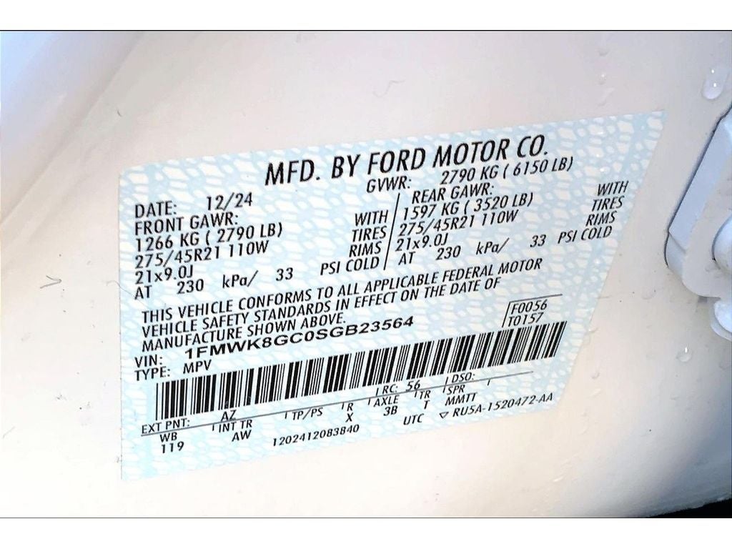 Sun and Sound Package: Panoramic Vista Roof with Power Shade; Multicontour Seats with Front Active Motion. Equipment Group 400A Standard Package: 21" Magnetite-Painted Aluminum Wheels; Heated and Ventilated Miko Sport Captain's Chairs; 3.58 Non-Limited Slip Rear Axle; Engine: 3.0L EcoBoost V6; 10-Speed Automatic Transmission; P275/45R21 AS BSW Tires; B&O Sound System by Bang and Olufsen. Star White Metallic TC. Front and 2nd Rows Floor Liners with Carper Floor Mats. 3rd Row All-Weather Floor Liners with 2nd Row Captain's Charis. **Equipment listed is based on original vehicle build and subject to change. Please confirm the accuracy of the included equipment by calling the dealer prior to purchase.**